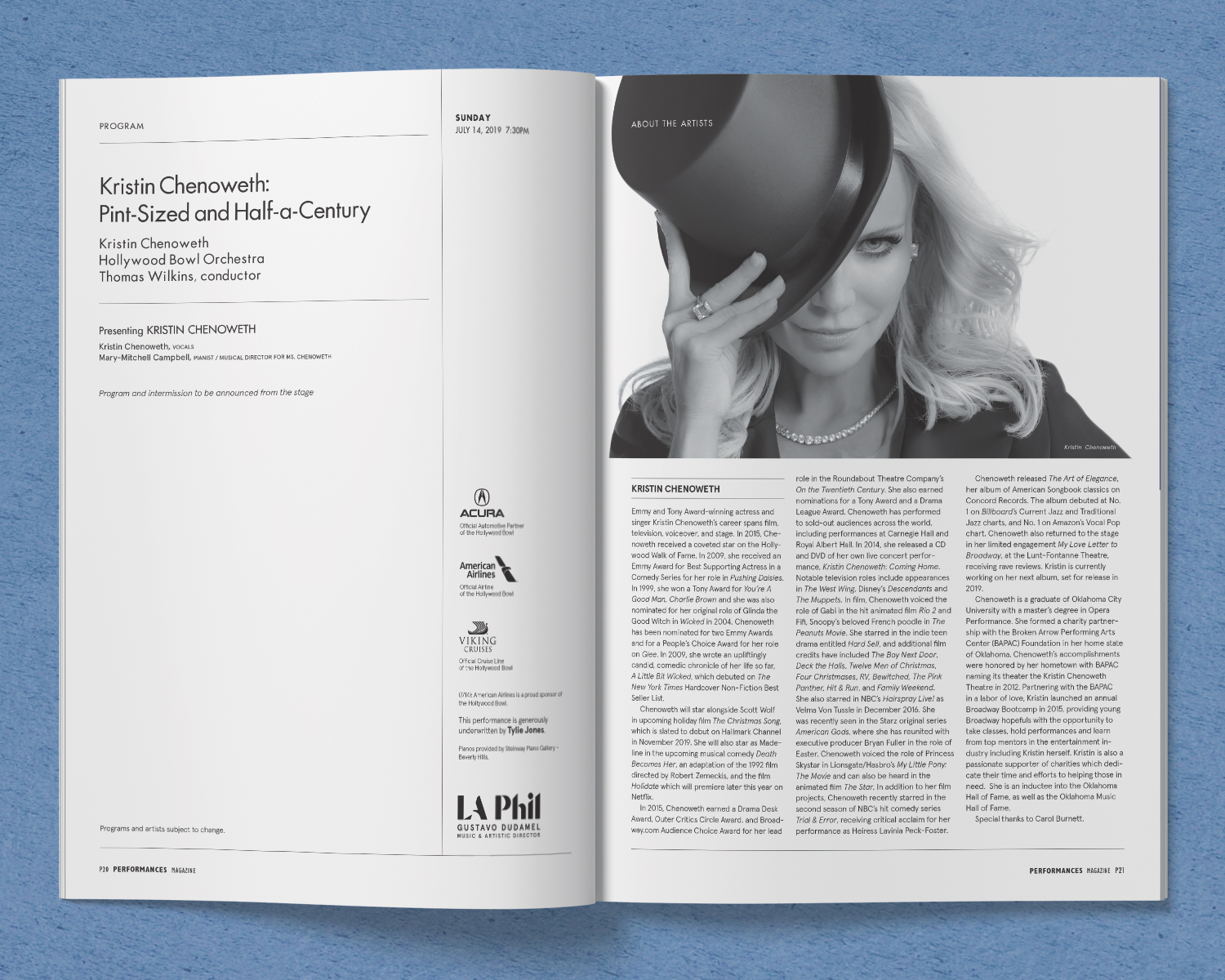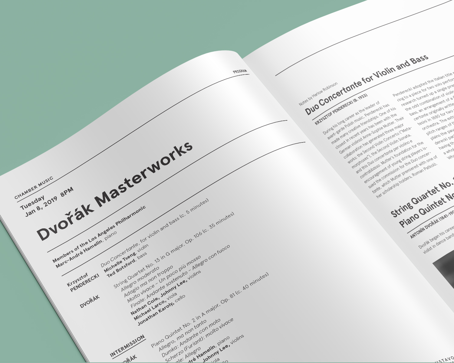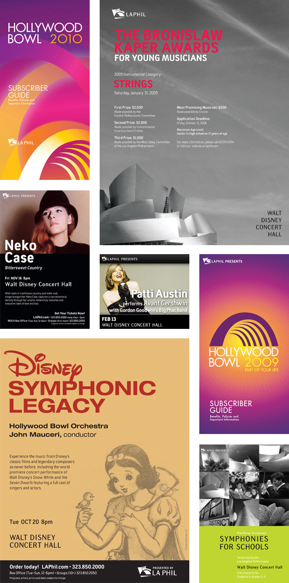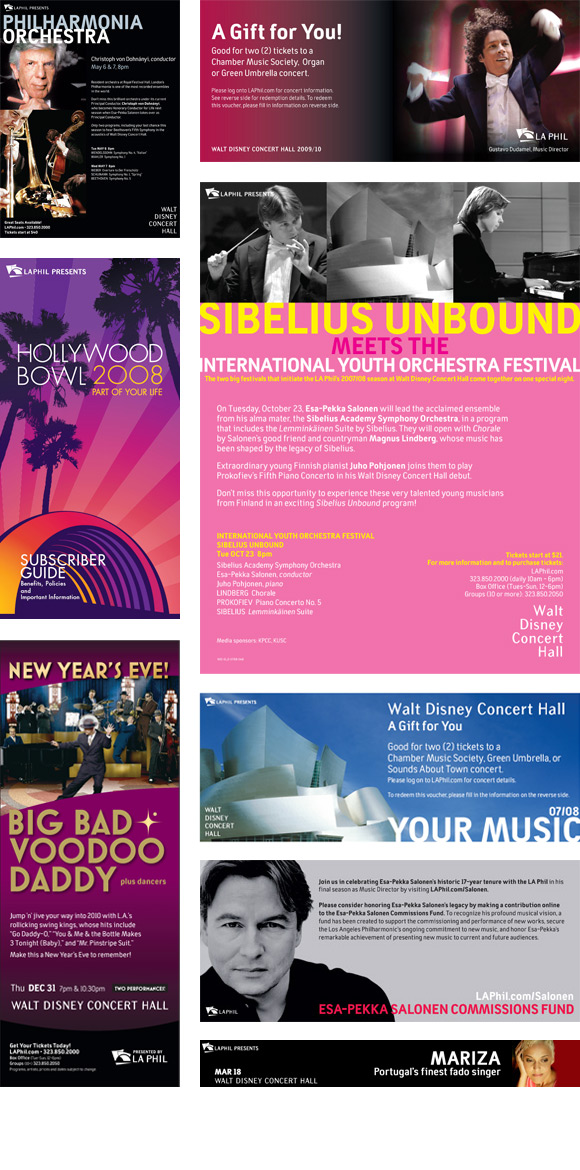 I’ve been honored to work with the LA Phil to create editorial and collateral design over the years, starting by supporting collateral production for the marketing team and their core branding – from digital ads, brochures, flyers to donor forms and mailers. And then taking over editorial layout for both venues’ program magazines and their almost-daily concert schedule.
