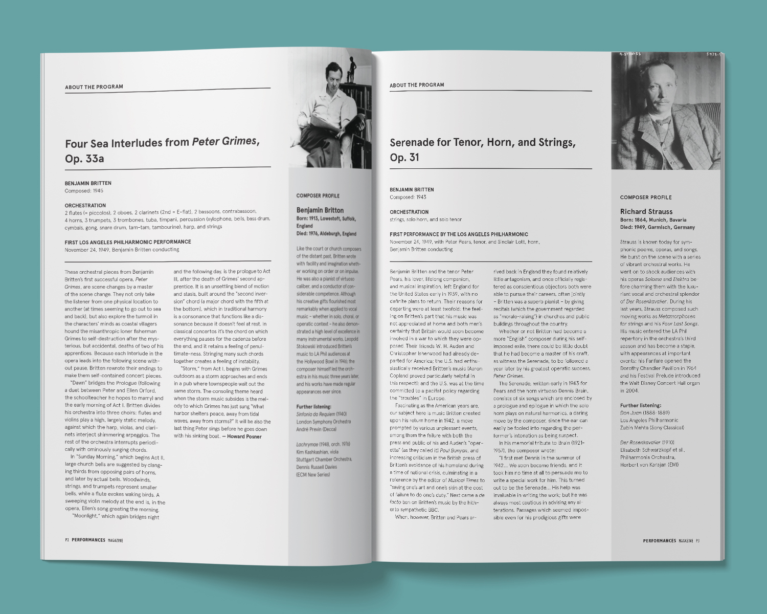 LA Phil Editorial and Collateral design meant working with the Publications department on a daily basis to gather, assess and structure raw text and images from writers, artists and producers to build finished magazine layouts, based on LA Phil’s core design, from start to finish for all Walt Disney Concert Hall and Hollywood Bowl concert programs. Fast-paced fun!