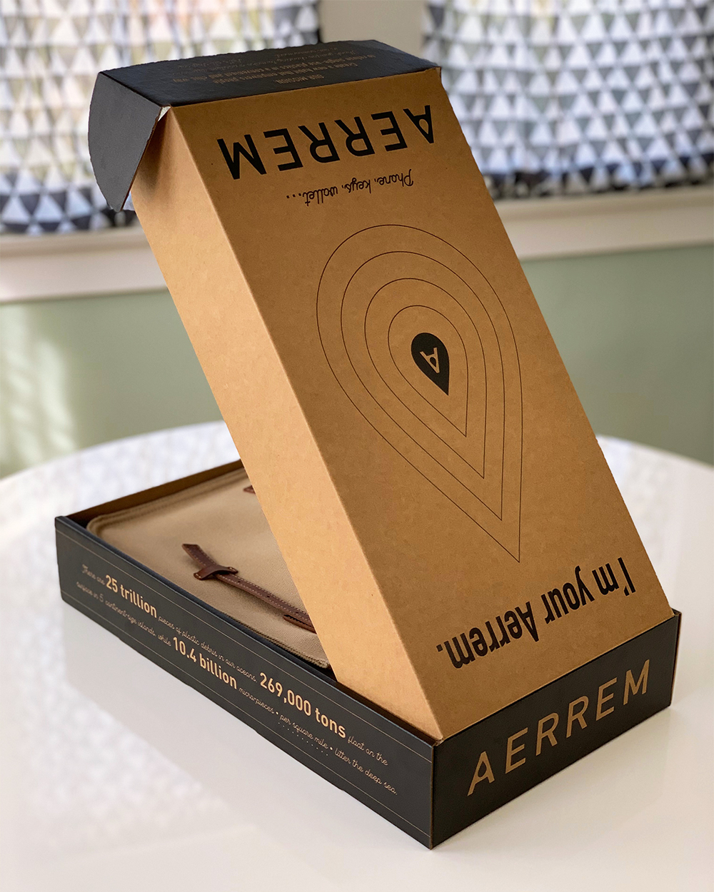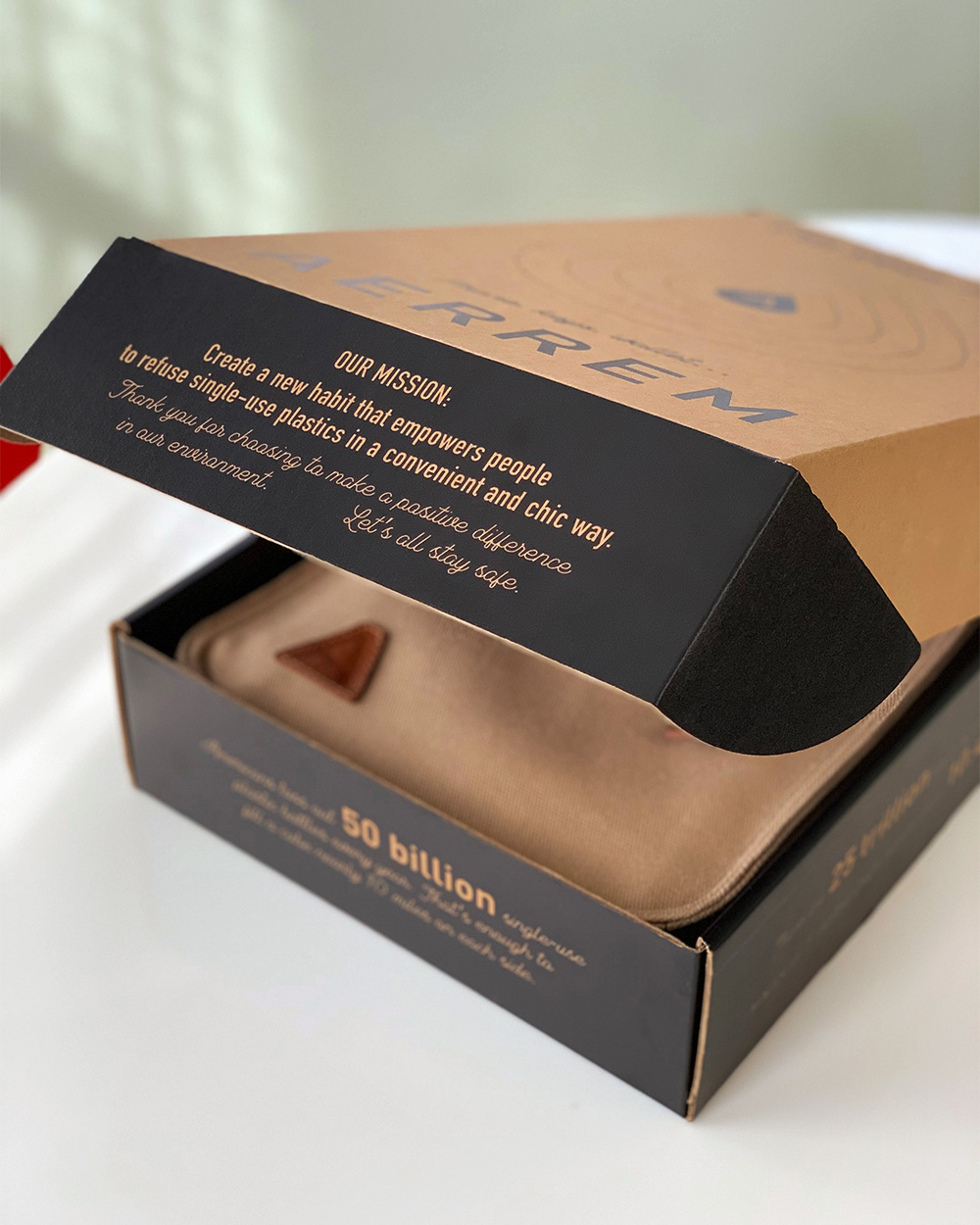 The design challenge was to create packaging for Aerrem using a mailer box-as-packaging that embodied the product’s chic and sustainable nature without any previous brand visual identity, outside of the logo, to play with. It needed to be refined, classy and fun, as well as being educational and fully recyclable. And it all had to be done in one color.